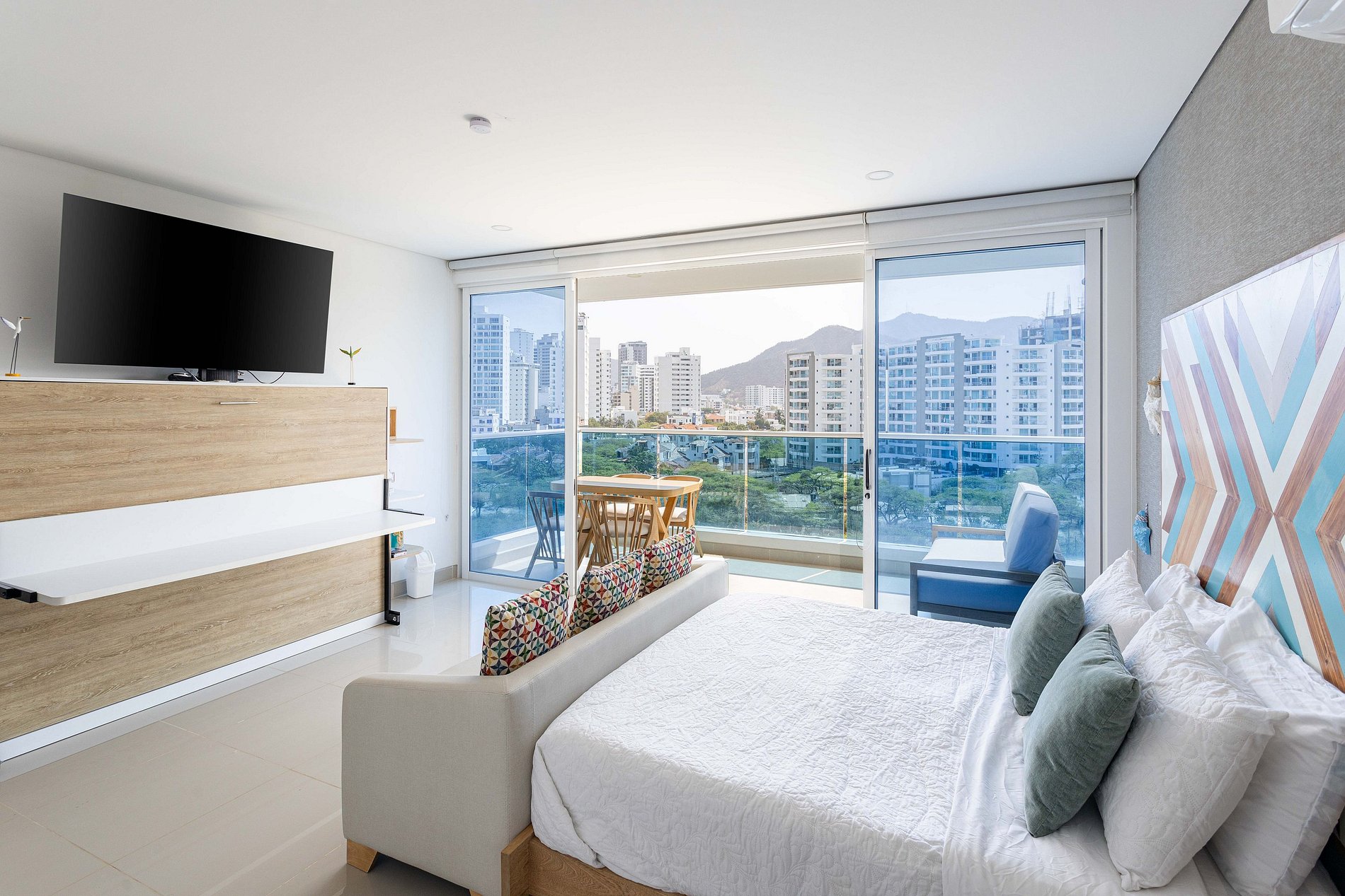 Este exclusivo apartamento cuenta con Aire Acondicionado, es nuevo esta completamente dotado, dos camas (una de ellas abatible) El edificio cuenta con 5 piscinas, lobby de doble altura, 7 jacuzzi, bar, BBQ Golfito, Salida directa a playa Privada, restaurante y cancha de Mini futbol. El apartamento esta a pocos pasos de la playa, tiene vista en diagonal al mar y a la sierra nevada de santa marta, es muy fresco por la brisa que baja de esta.