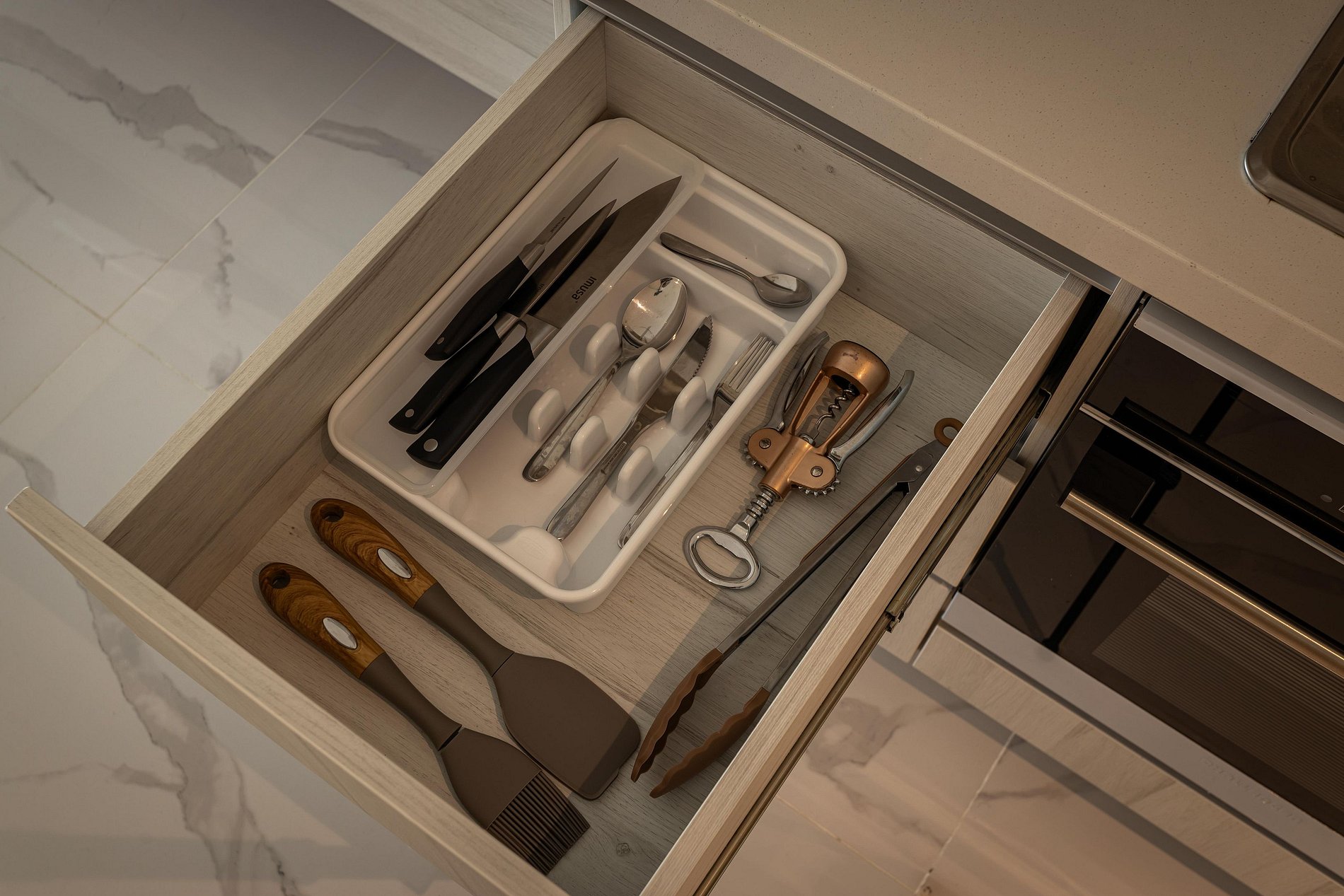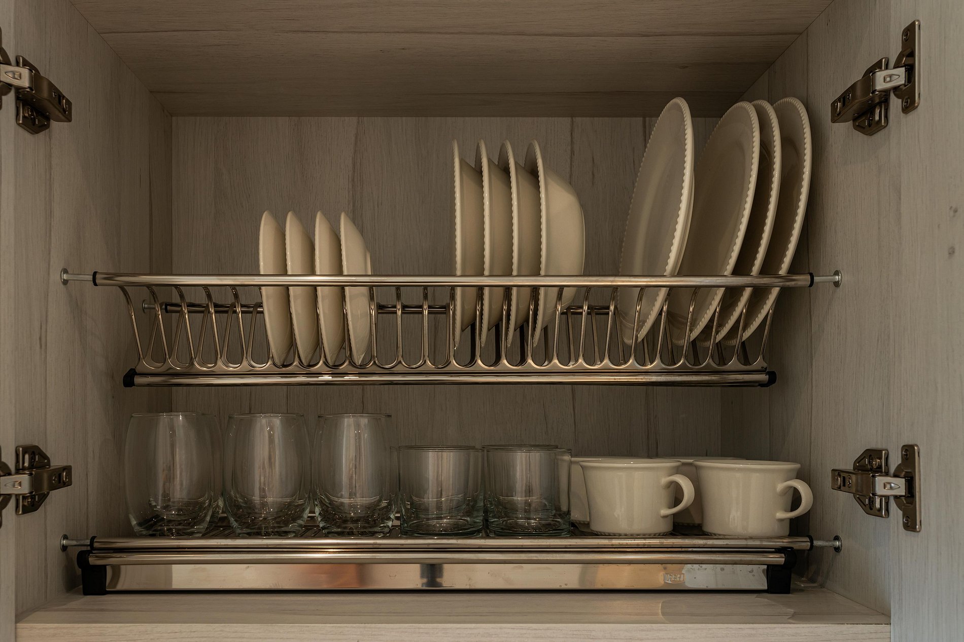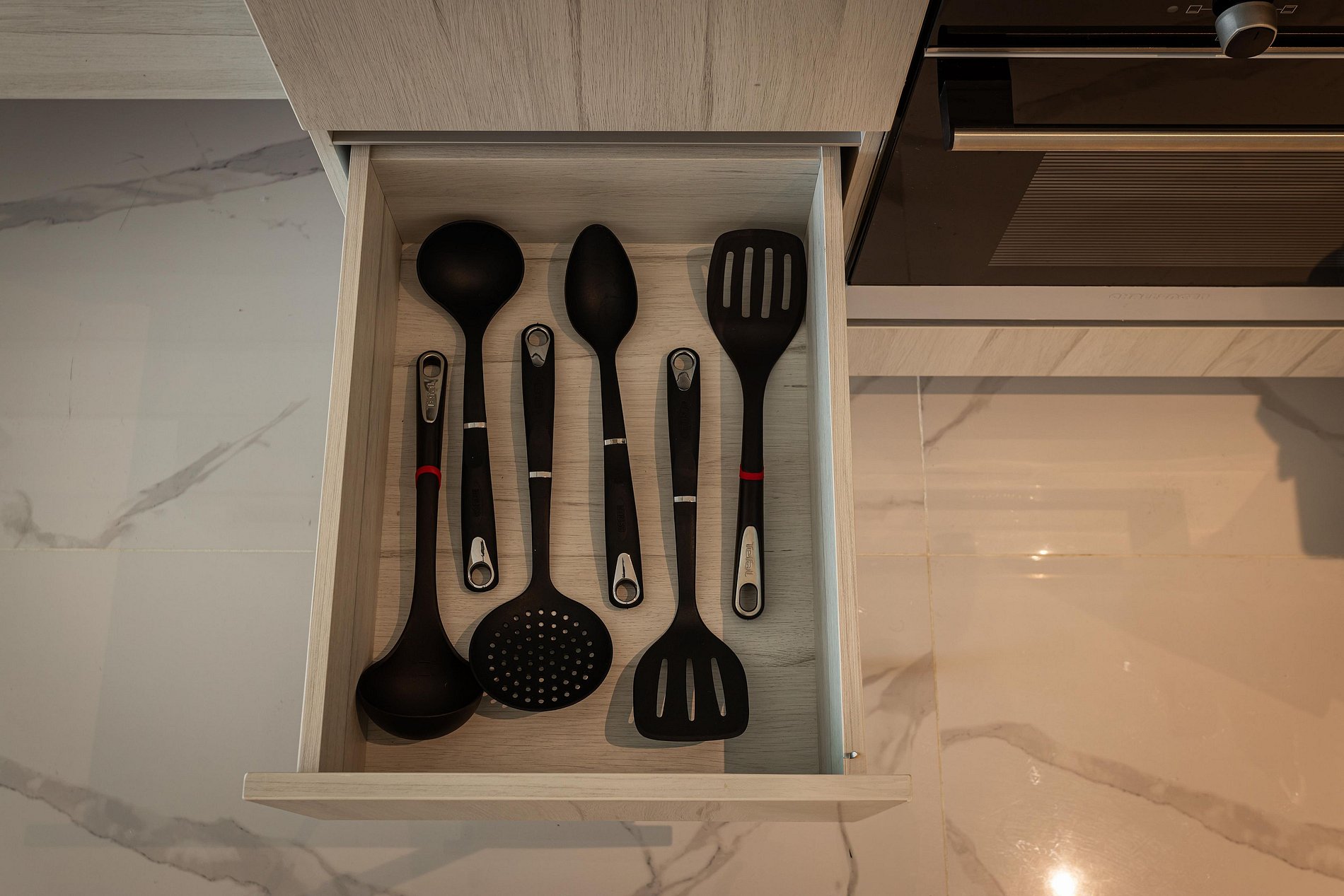 Cocina completamente equipada con estufa, horno tradicional, horno microondas y utensilios para cocinar.