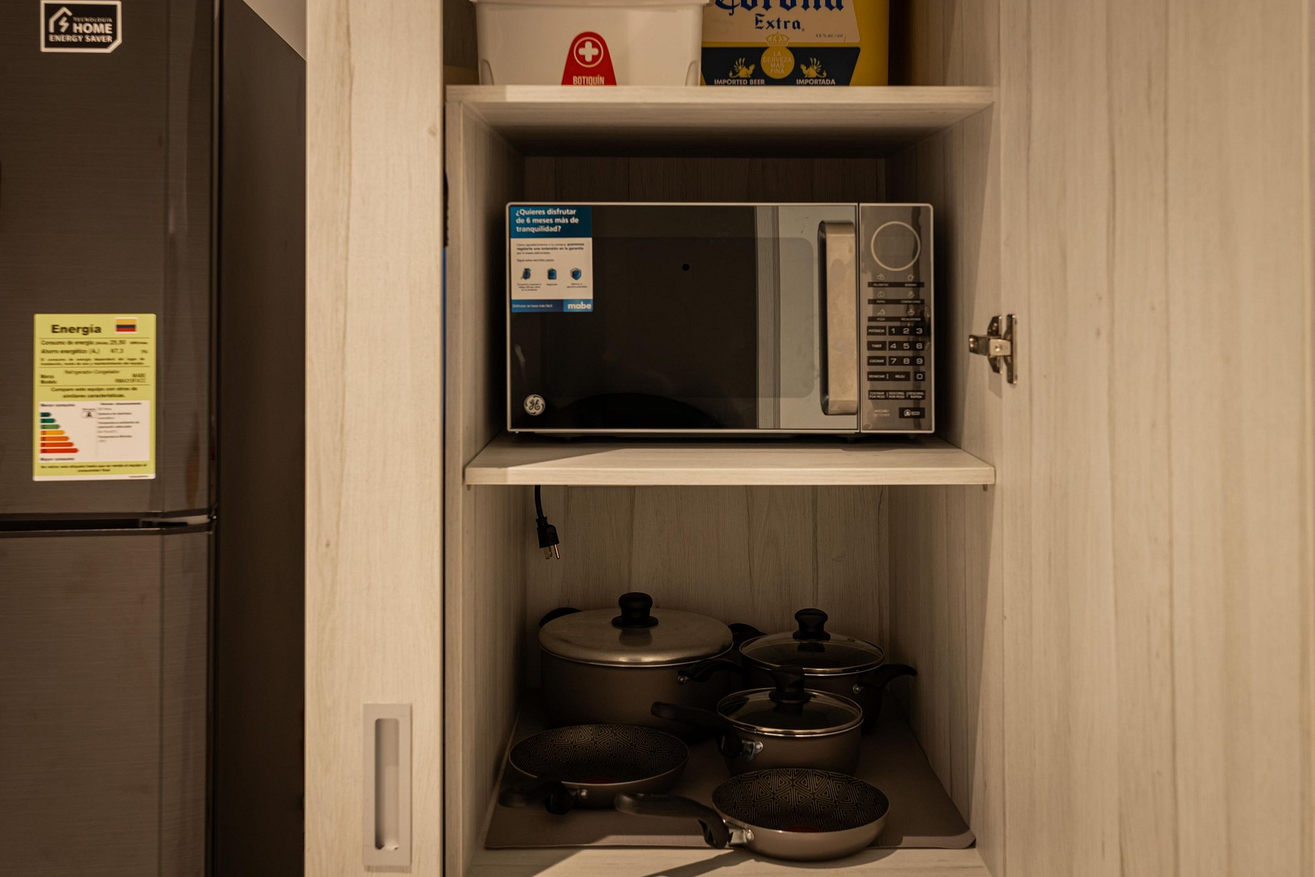Cocina completamente equipada con estufa, horno tradicional, horno microondas y utensilios para cocinar.