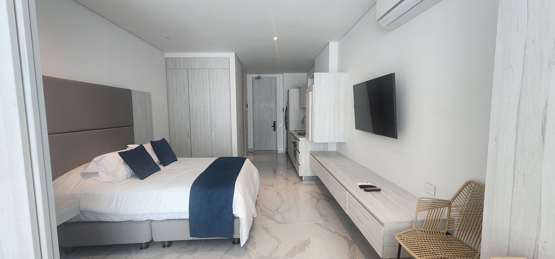 Disfruta de una estancia inolvidable en nuestro loft con dos espacios dotado con dos camas, ubicada en el piso 15 de un moderno edificio recientemente construido en la exclusiva zona de Bello Horizonte, Santa Marta.