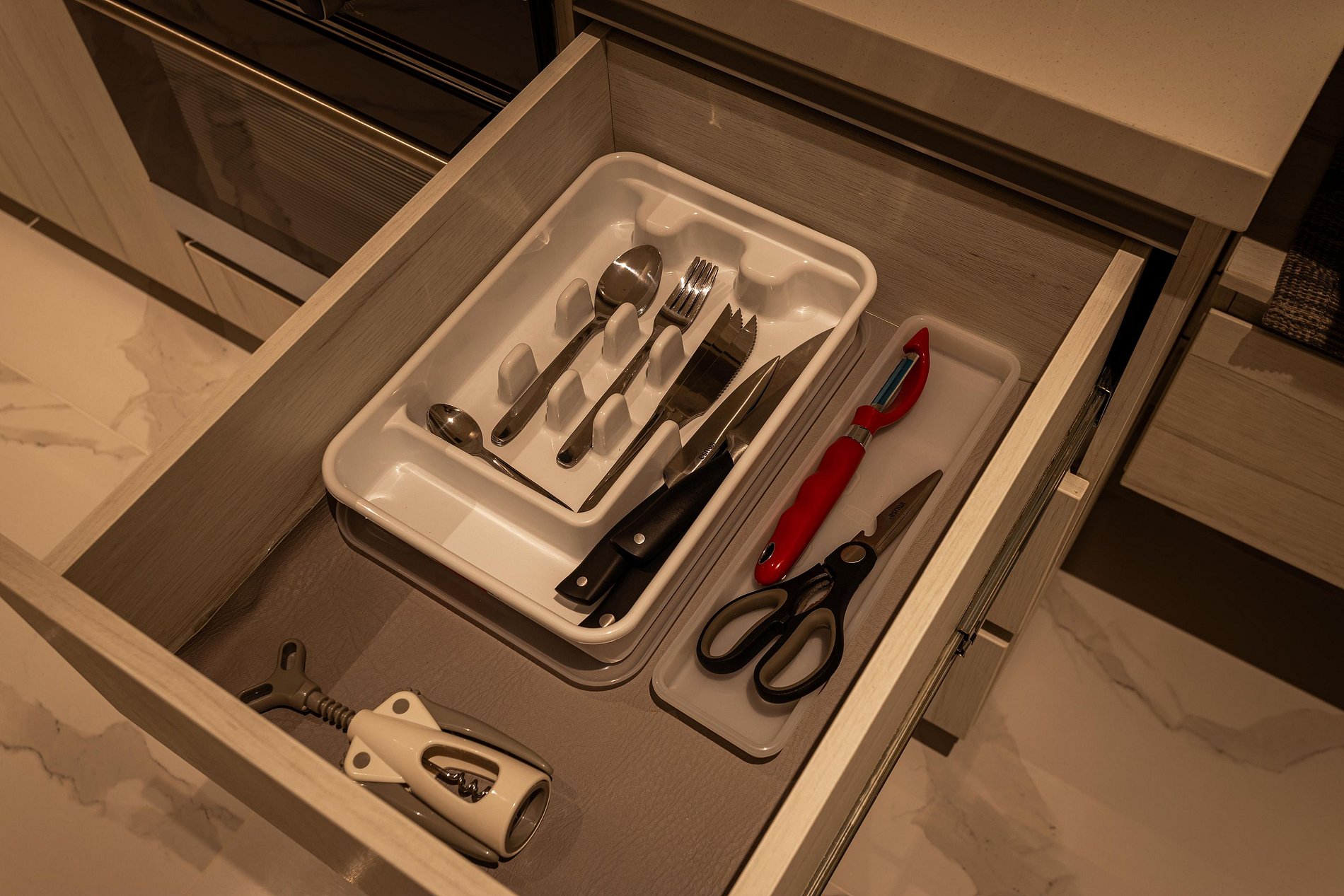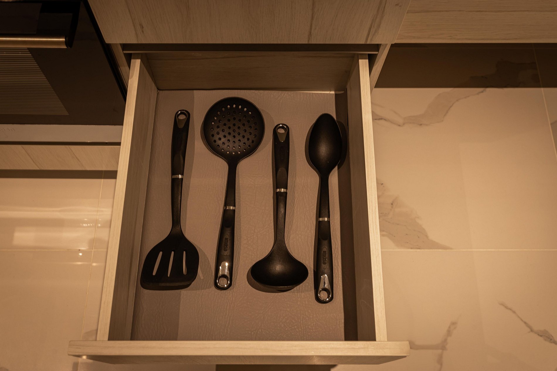 Cocina completamente equipada con estufa, horno tradicional, horno microondas y utensilios para cocinar.