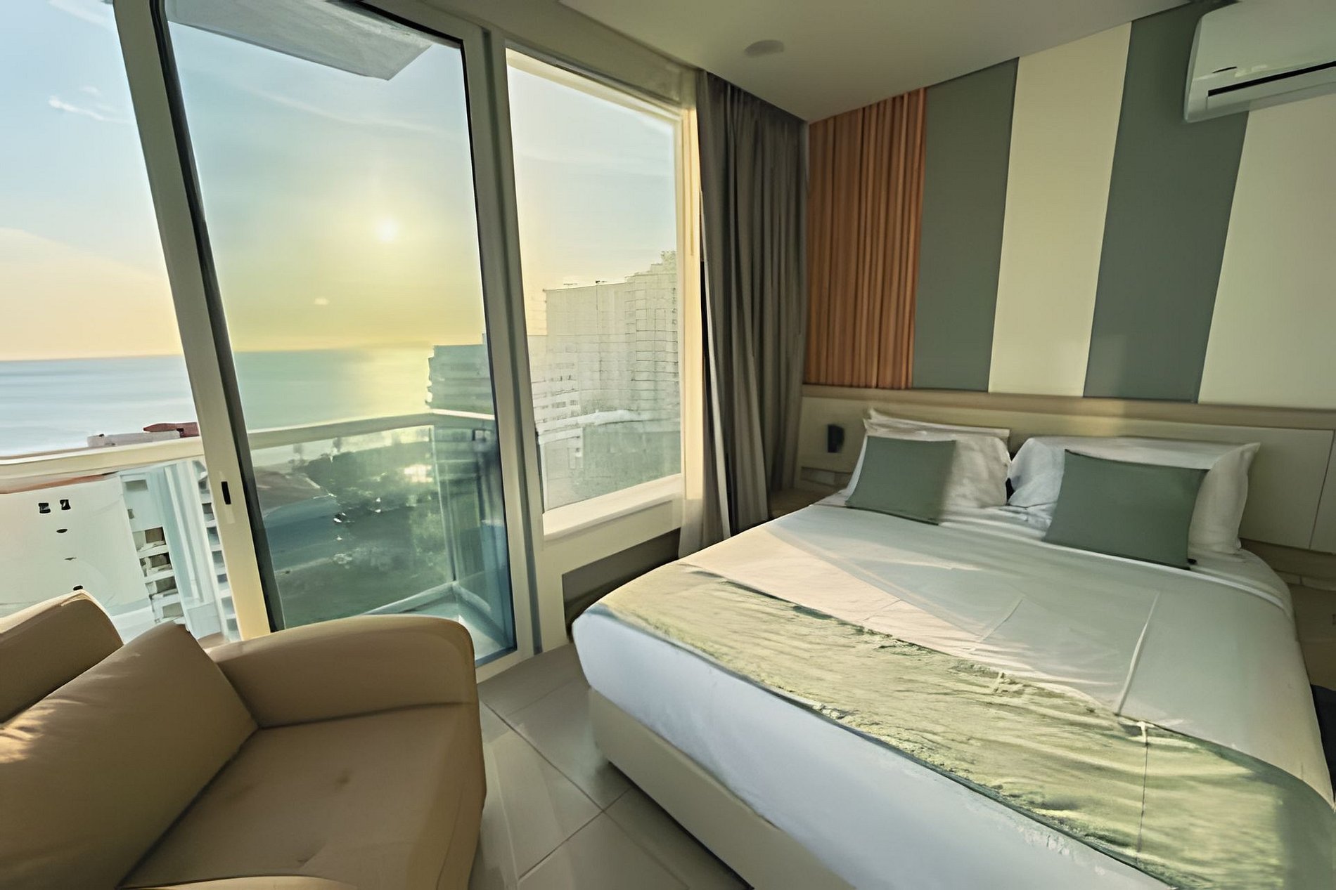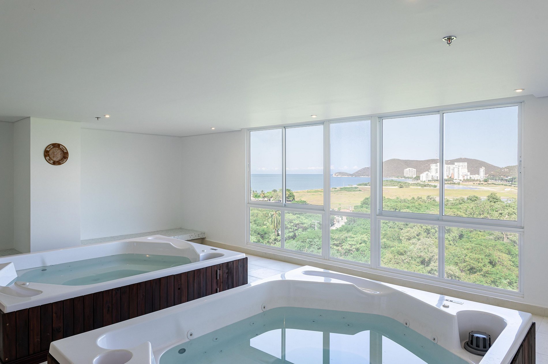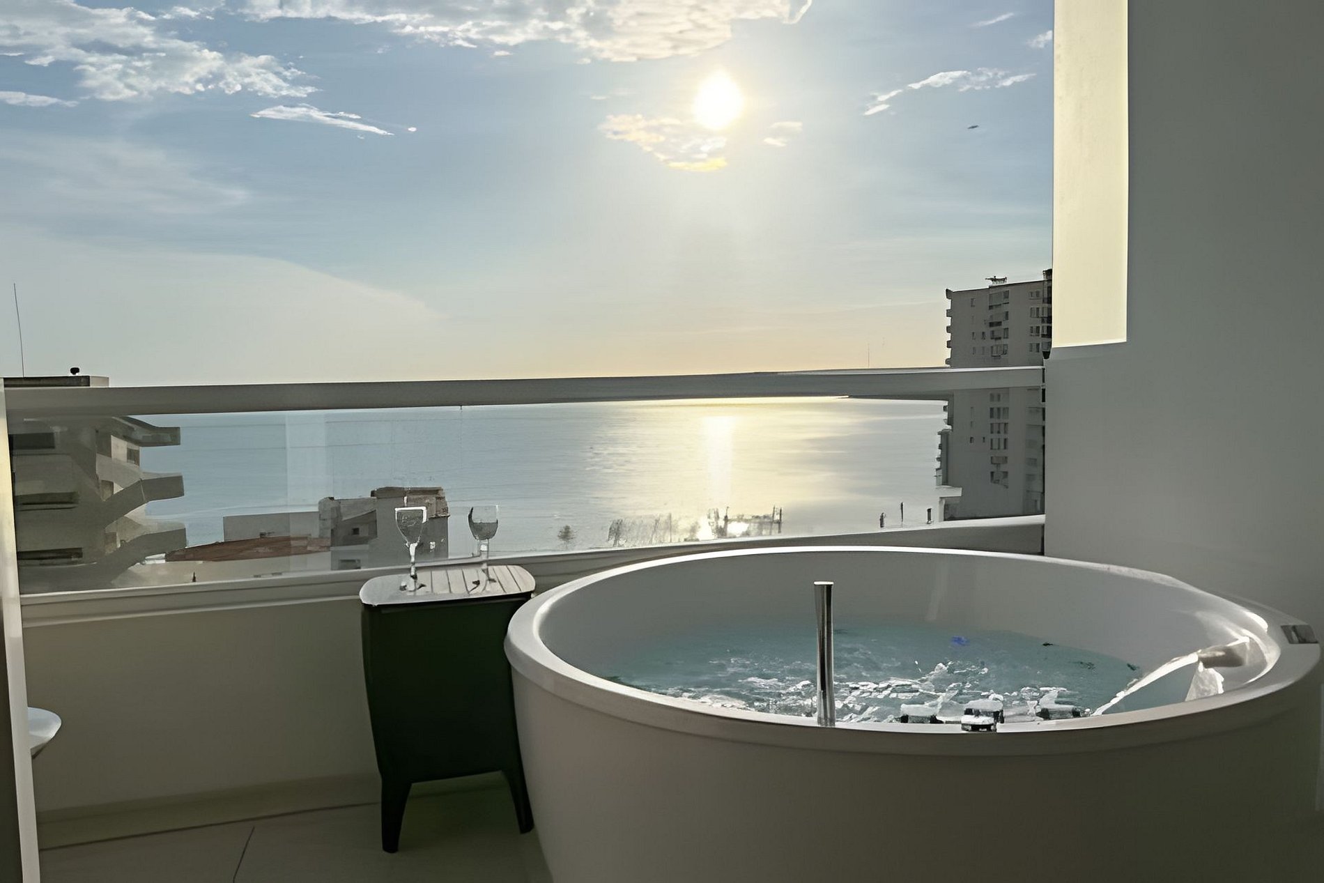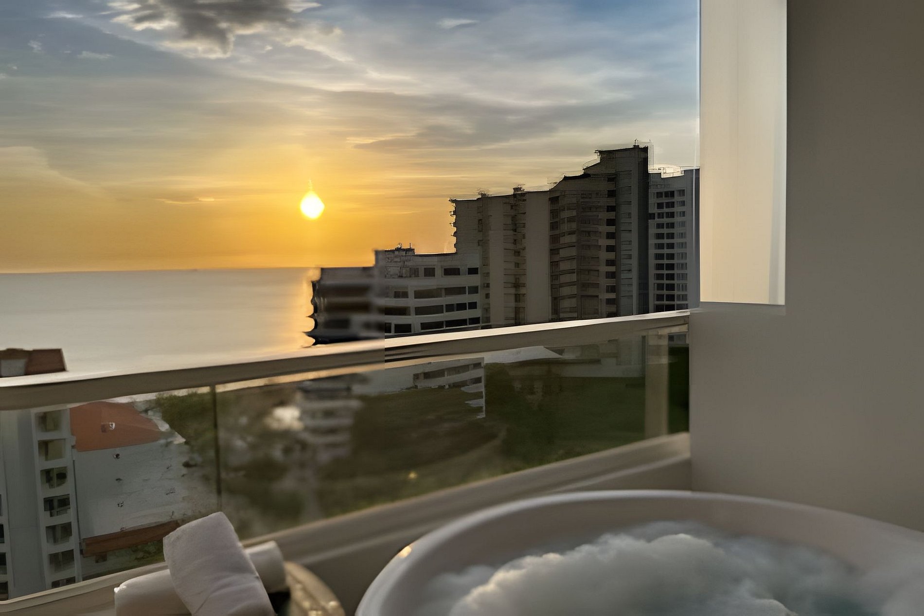 Room 1 1 Queen bed 1 armchair (Converts into a single sofa bed) 360 ocean and sunset views Room 2: 1 double bed 1 separate bathroom Living room: 1 sofa bed 1 social bathroom Equipped kitchen + coffee maker + blender Balcony with jacuzzi + Balcony in master bedroom Ocean + sunset views Air conditioning Fast Wi-Fi Smart TV Blackout curtains and veil One block from the beach 12th floor Beach and bath towels + soap Special decorations (optional) Contact for transportation available Additional toilet option Safe area and quiet with 24-hour surveillance