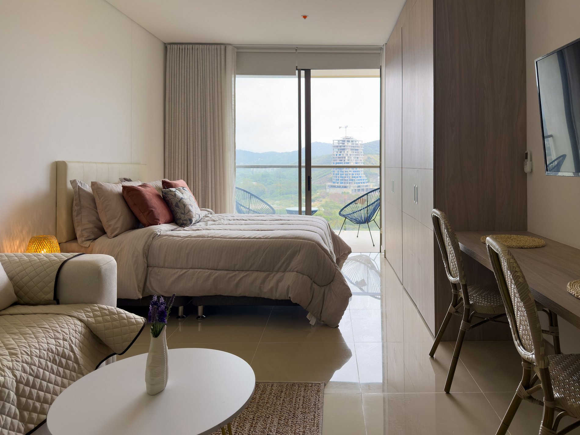 Desde que cruzas la puerta, el ambiente cambia. La luz natural, el silencio del entorno y la vista abierta a las montañas crean una sensación inmediata de calma. Este apartamento fue pensado para quienes valoran el descanso, el orden y los espacios bien diseñados, sin renunciar a una ubicación estratégica en Santa Marta.