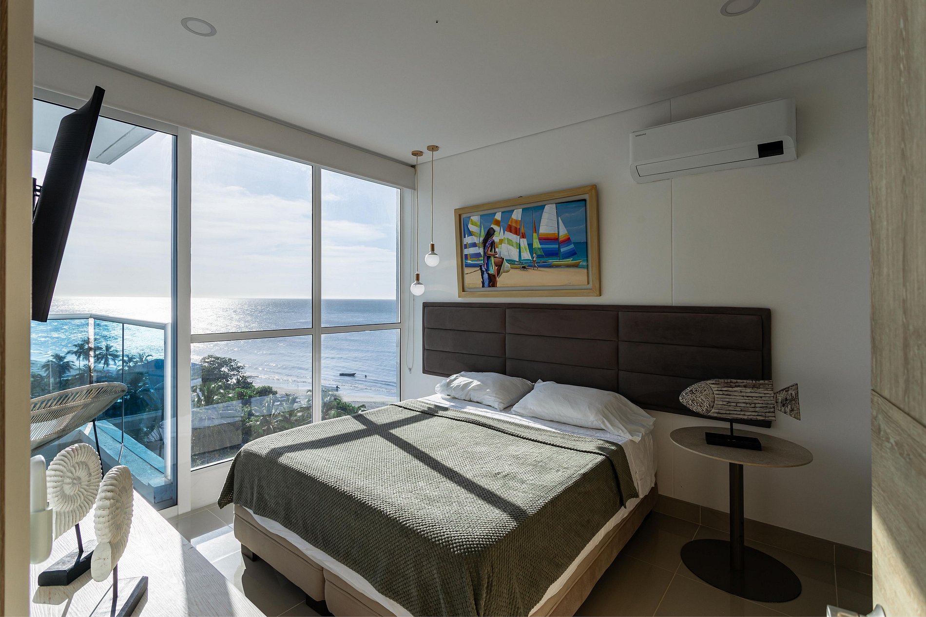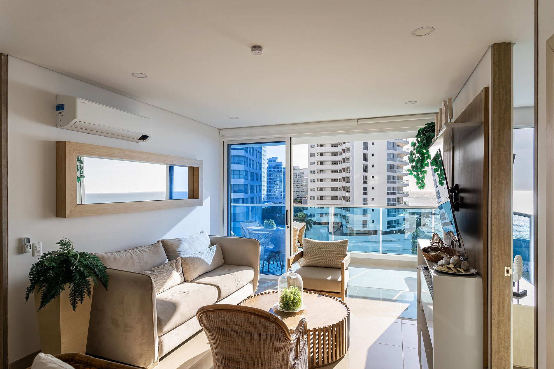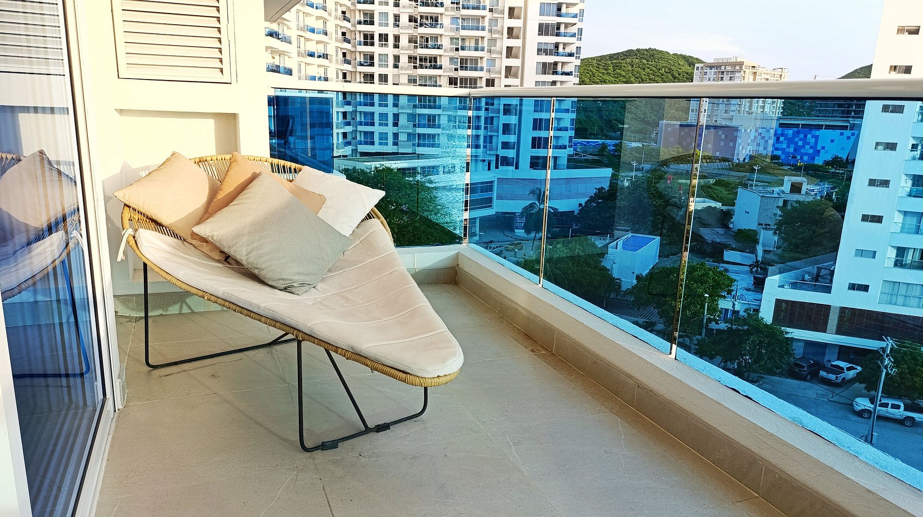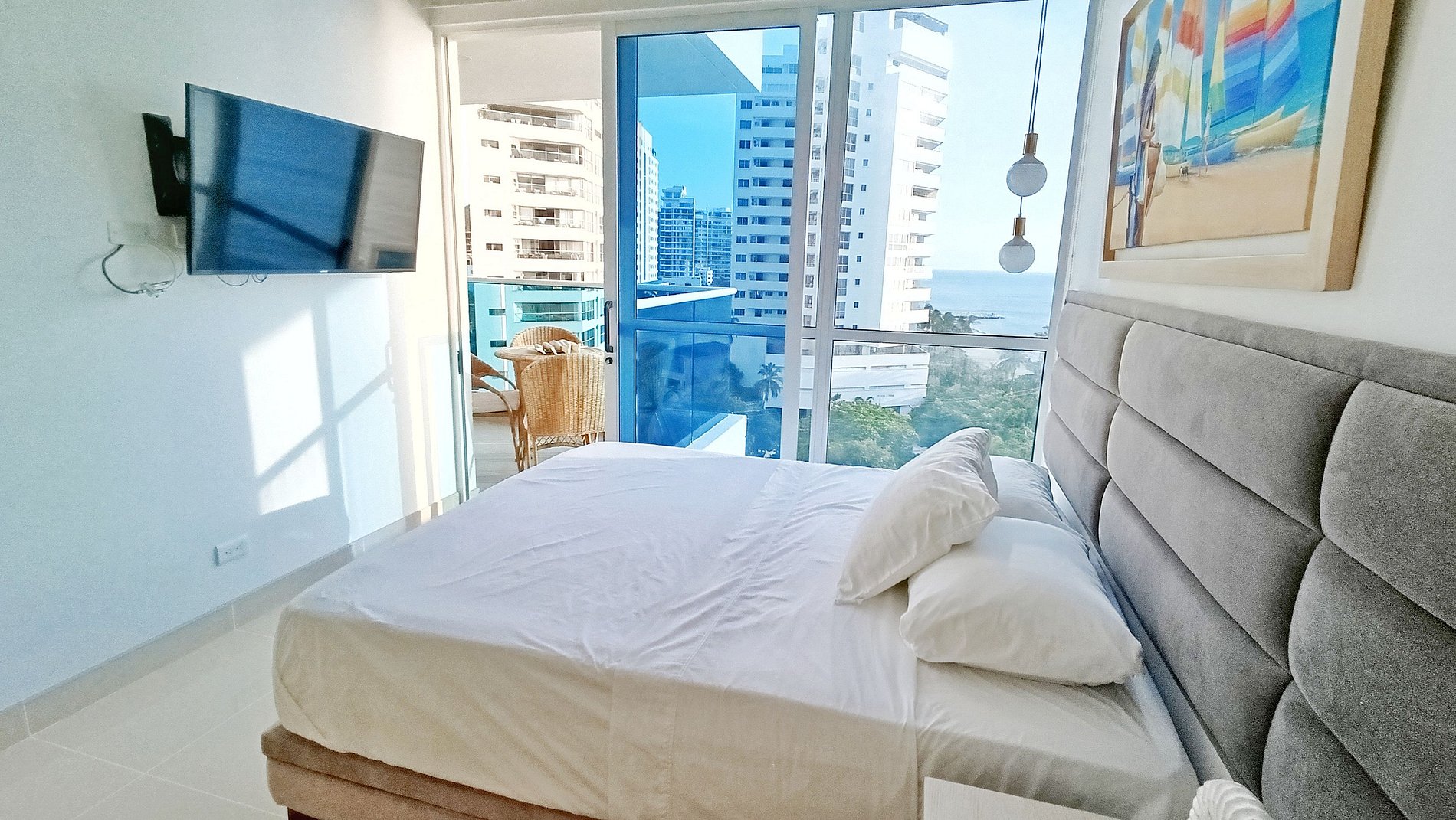 Este exclusivo apartamento cuenta con Aire Acondicionado, es nuevo esta completamente dotado, dos camas (una de ellas abatible) El edificio cuenta con 5 piscinas, lobby de doble altura, 7 jacuzzi, bar, BBQ Golfito, Salida directa a playa Privada, restaurante y cancha de Mini futbol. El apartamento esta a pocos pasos de la playa, tiene vista en diagonal al mar y a la sierra nevada de santa marta, es muy fresco por la brisa que baja de esta.