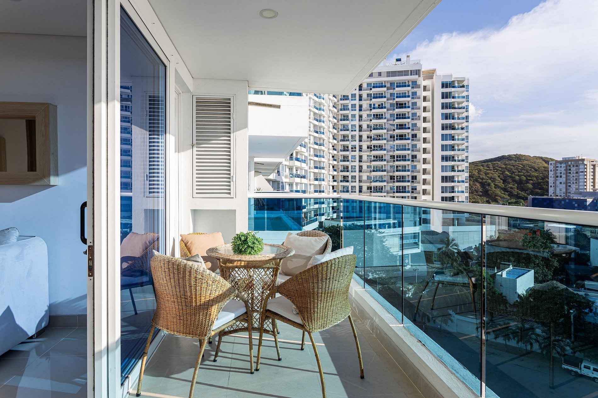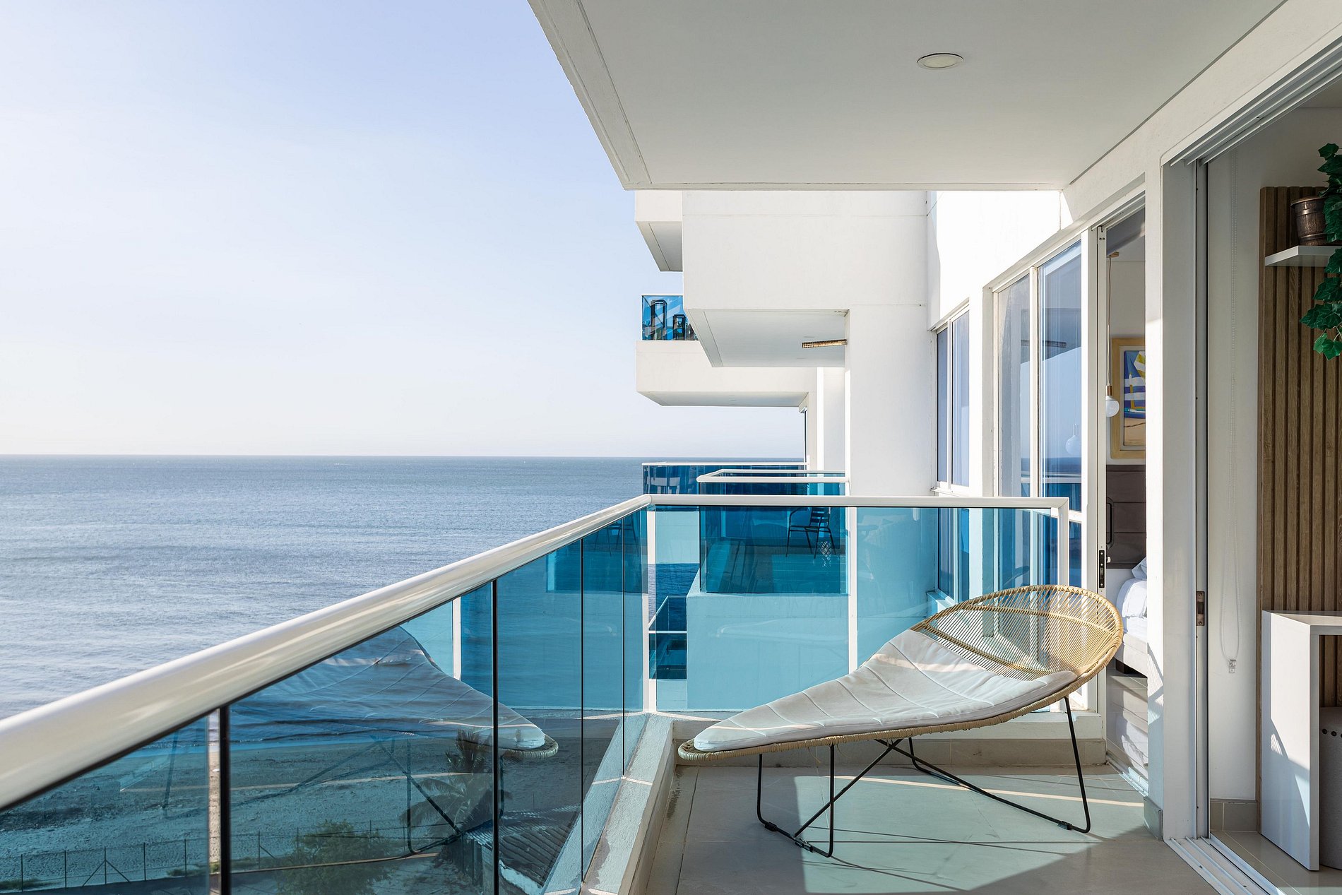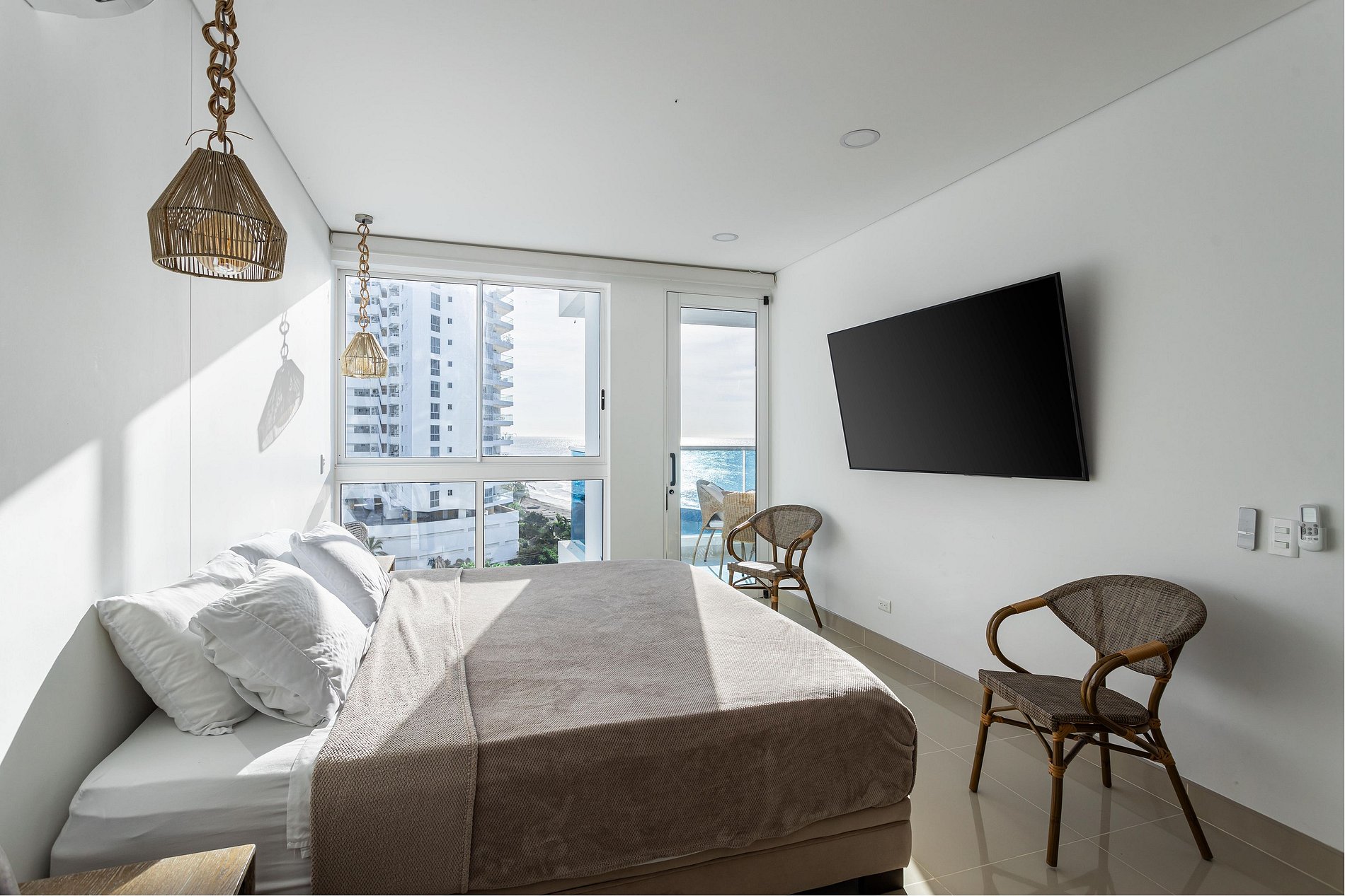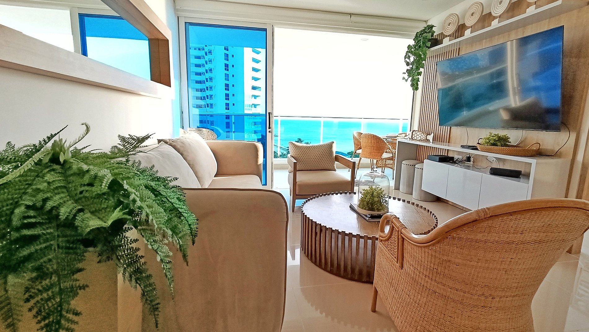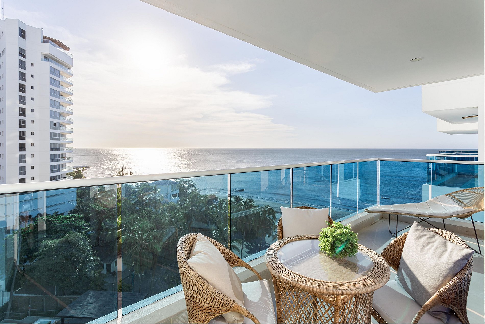 Este exclusivo apartamento cuenta con Aire Acondicionado, es nuevo esta completamente dotado, dos camas (una de ellas abatible) El edificio cuenta con 5 piscinas, lobby de doble altura, 7 jacuzzi, bar, BBQ Golfito, Salida directa a playa Privada, restaurante y cancha de Mini futbol. El apartamento esta a pocos pasos de la playa, tiene vista en diagonal al mar y a la sierra nevada de santa marta, es muy fresco por la brisa que baja de esta.