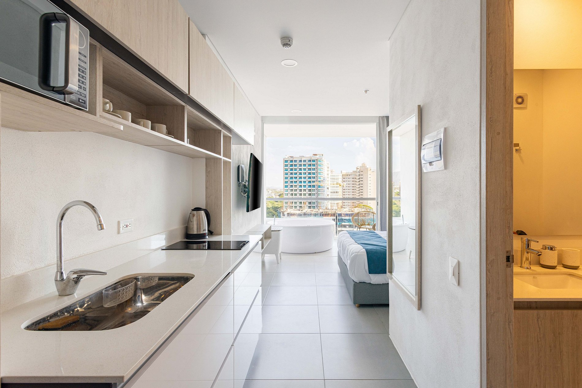 ¿Buscas un apartamento urbano con todas las comodidades del hogar y más? Descubre nuestro exclusivo alojamiento que combina elegancia moderna y vistas diagonales al mar. Imagina terminar tu día sumergiéndote en una bañera de hidromasaje en tu propio balcón, con el mar y las piscinas a tus pies. Reserva ahora y transforma tu viaje en una experiencia de pura serenidad.