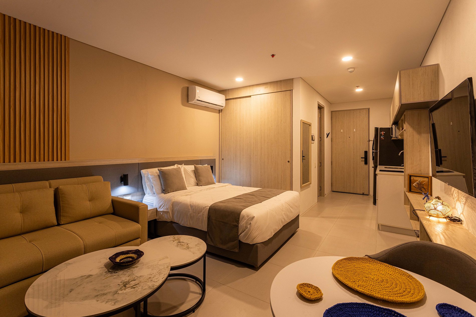 Cada detalle del apartamento está diseñado para que te sientas como en casa: cama queen confortable, sofá cama amplio, aire acondicionado, WiFi de buena velocidad, cocina equipada y un espacio funcional ideal tanto para estancias cortas como largas. El edificio ofrece seguridad 24/7 y acceso controlado, brindando tranquilidad absoluta para familias, parejas y viajeros de negocios.