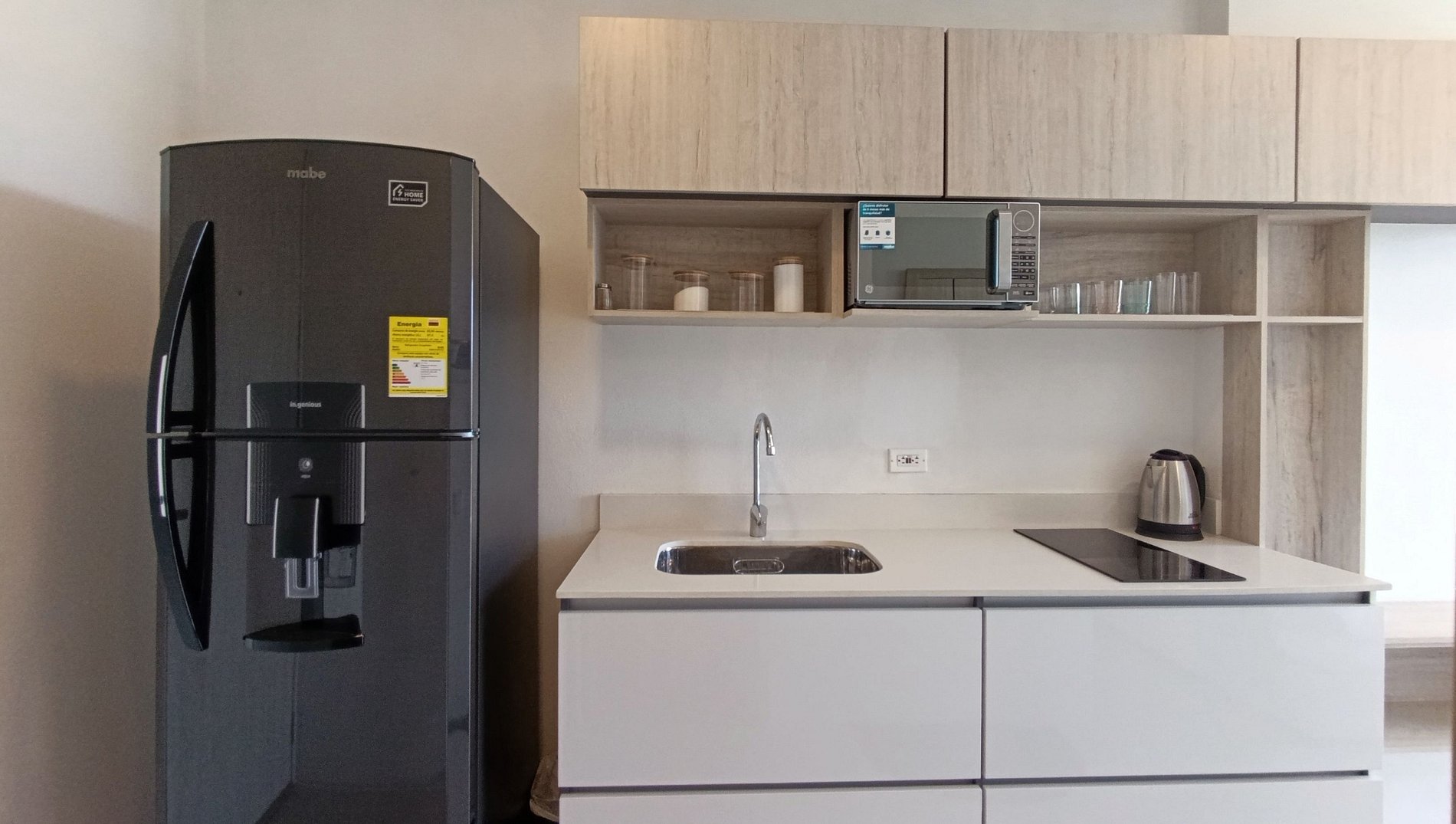 Encuentra con Miethaus la estadia perfecta, este aparta suite cuenta con todo lo necesario para una comoda y tranquila estadia,, si lo deseas puedes cocinar ya que la cocina esta dotada con lo necesario para hacerlo, tiene un sofa cama doble el cual se deja para uso de un tercer huesped con una sabana y una manta, encontraras tambien sillas para llevar a la playa sin ninguna restriccion, esta ubicado en el sector de Bello Horizonte a pocos pasos de las mejores playas de Santa Marta.