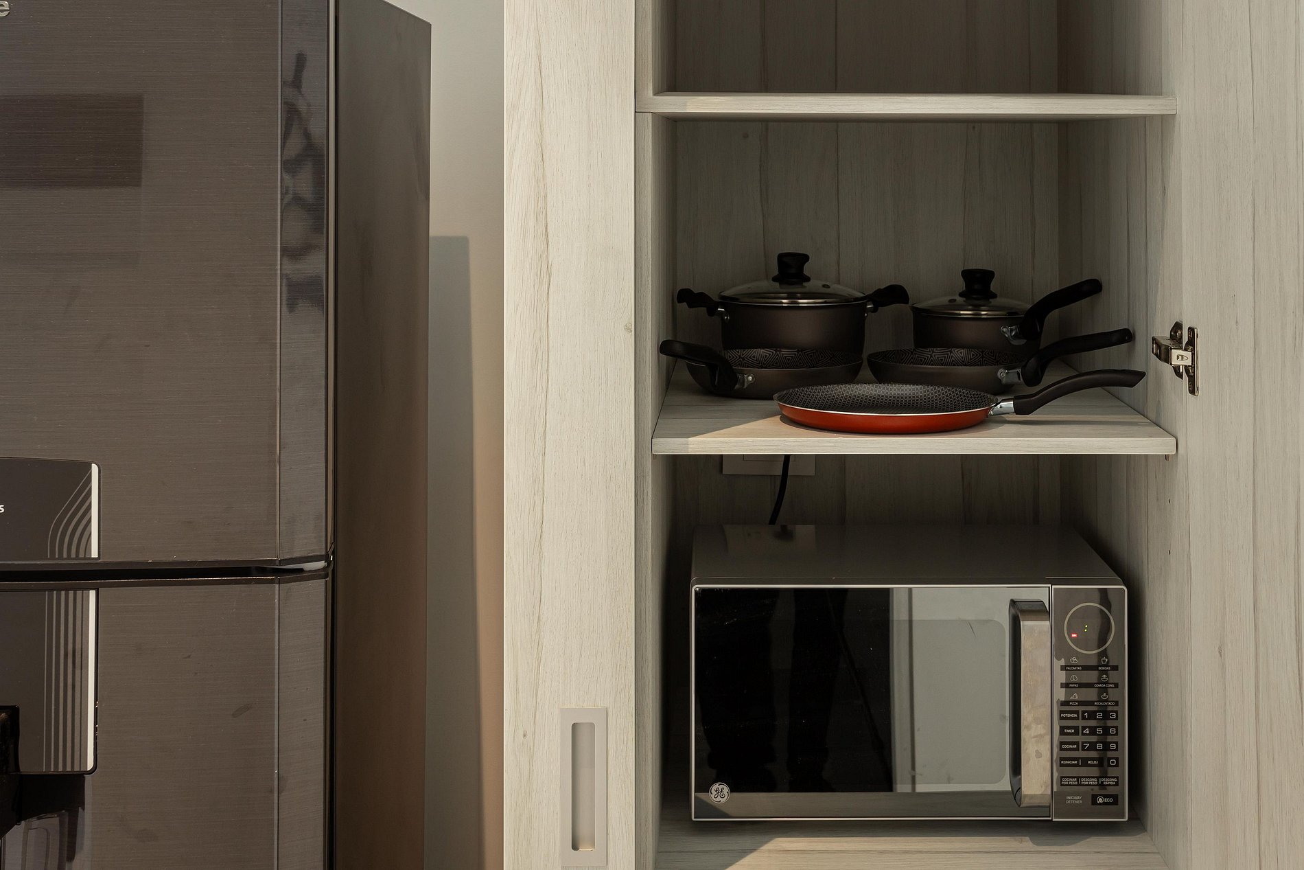 Cocina completamente equipada con estufa, horno tradicional, horno microondas y utensilios para cocinar.